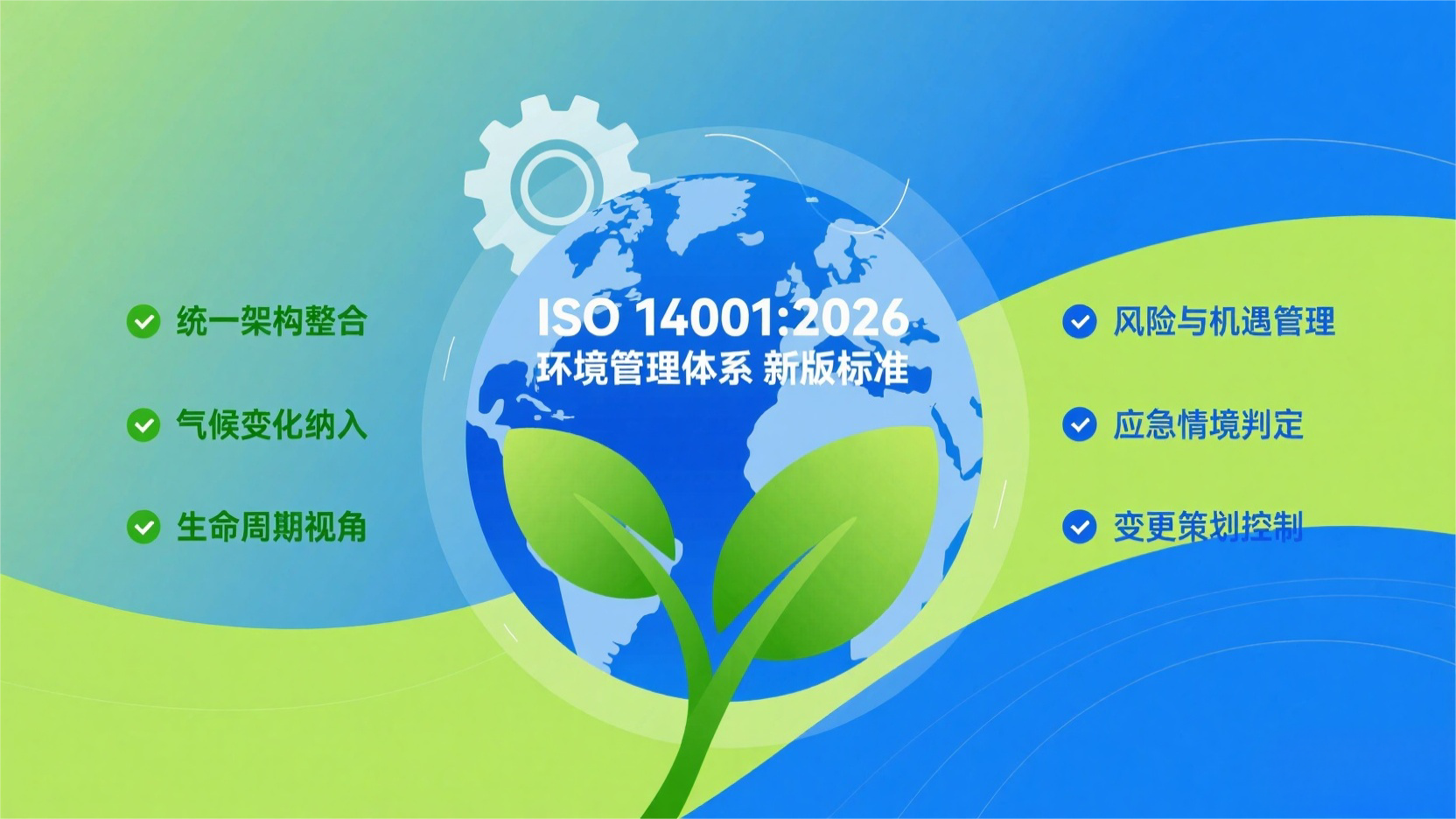 | 2025 年,国际标准化组织(ISO)正式发布 ISO 14001:2026 国际标准草案(DIS),标志着环境管理体系进入 “气候变化强制管控” 新时代。相较于 2015 版,新版标准在延续核心框架的基础上,聚焦气候风险、全链条管理与体系实用性,对企业环境管理提出更精准、更具操作性的要求。同时,结合 ISO 9001:2026 转版动态中与环境管理相关的协同调整,企业需同步理解跨体系关联要求,提前布局应对。 一、标准换版核心日程:时间紧、过渡期缩短,新申请企业需优先适配新版 ISO 14001:2026 的发布与实施节奏明确,企业需把握关键节点,避免合规滞后: 1.当前阶段(2025 年):DIS 草案已发布,进入为期 12 周的全球投票表决期,企业可提前对照草案开展差距分析。 2.后续关键节点: ◦2025 年 12 月:发布最终国际标准草案(FDIS),标准内容基本定型。 ◦2026 年 1 月:ISO 14001:2026 正式生效。 ◦2026 年 6 月:新申请认证的企业需完全按照新版标准执行,无缓冲期。 3.过渡期特殊安排:不同于常规 3 年过渡期,因本次修订为 “轻量级调整”(非全面换版),过渡期可能缩短至 18-24 个月,已获 2015 版认证的企业需在 2027 年 7 月前完成转版。 二、六大核心变化:聚焦气候、全链条与管理精细化,**企业应对难点对比 2015 版,ISO 14001:2026 DIS 草案的变化集中在 6 大领域,且部分要求与 ISO 9001:2026 的 “气候变化关联调整” 形成协同,企业需重点关注跨条款联动: