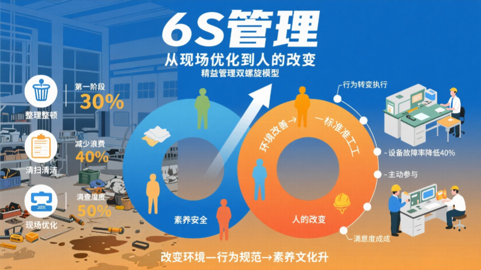 6S 管理:**制造现场 “脏乱差”,筑牢精益管理第一防线走进不少制造车间,你或许会看到这样的场景:货架上物料堆积如山,找一把扳手要翻遍工具箱;设备表面油污结块,角落里散落着废弃零件;通道被纸箱挤占,员工只能侧身通行…… 这些看似不起眼的 “小混乱”,实则是吞噬效率、引发风险的 “大隐患”。 而 6S 管理 —— 这套源于日本、风靡全球的现场管理工具,正是解决这些问题的 “金钥匙”。它并非简单的 “搞卫生、摆物料”,而是通过 “整理、整顿、清扫、清洁、素养、安全” 六大环节,让现场从 “无序混乱” 转向 “规范高效”,为企业降本、提效、保安全打下坚实基础。 一 读懂 6S:六大环节,环环相扣的 “现场优化逻辑” 核心提示:6S 是 “从环境到意识” 的递进 —— 前 4 个 S 聚焦 “现场硬件改善”,后 2 个 S 聚焦 “人的习惯养成”,缺一不可。 1. 整理(Seiri):给现场做 “减法”,清除 “无用负担”关键动作:区分 “必要品” 与 “非必要品”,果断 “断舍离” •判断标准: ✅ 必要品:当前生产必需、未来 3 天内会用、用途明确(如正在加工的零件、常用工具); ❌ 非必要品:闲置超 3 个月的设备、过期图纸、破损工具、废弃包装等。 •处置原则: ① 有价值物品:闲置设备移至仓库备用、完好物料调拨其他车间; ② 无价值物品:废弃零件集中报废、过期文件按规定销毁; ③ 危险品:过期化学品、易燃材料单独存放,联系专业机构处理。 实战案例:某机械车间推行整理后,清理出 2 台闲置 1 年的旧机床,变卖后回收资金 8 万元;清除 50 余箱废弃包装,释放仓储空间约 20㎡,后续可用于存放常用物料。 2. 整顿(Seiton):给物品 “安家”,实现 “30 秒取用”关键动作:“三定管理”(定品、定位、定量),让物品 “各就其位” •落地方法: