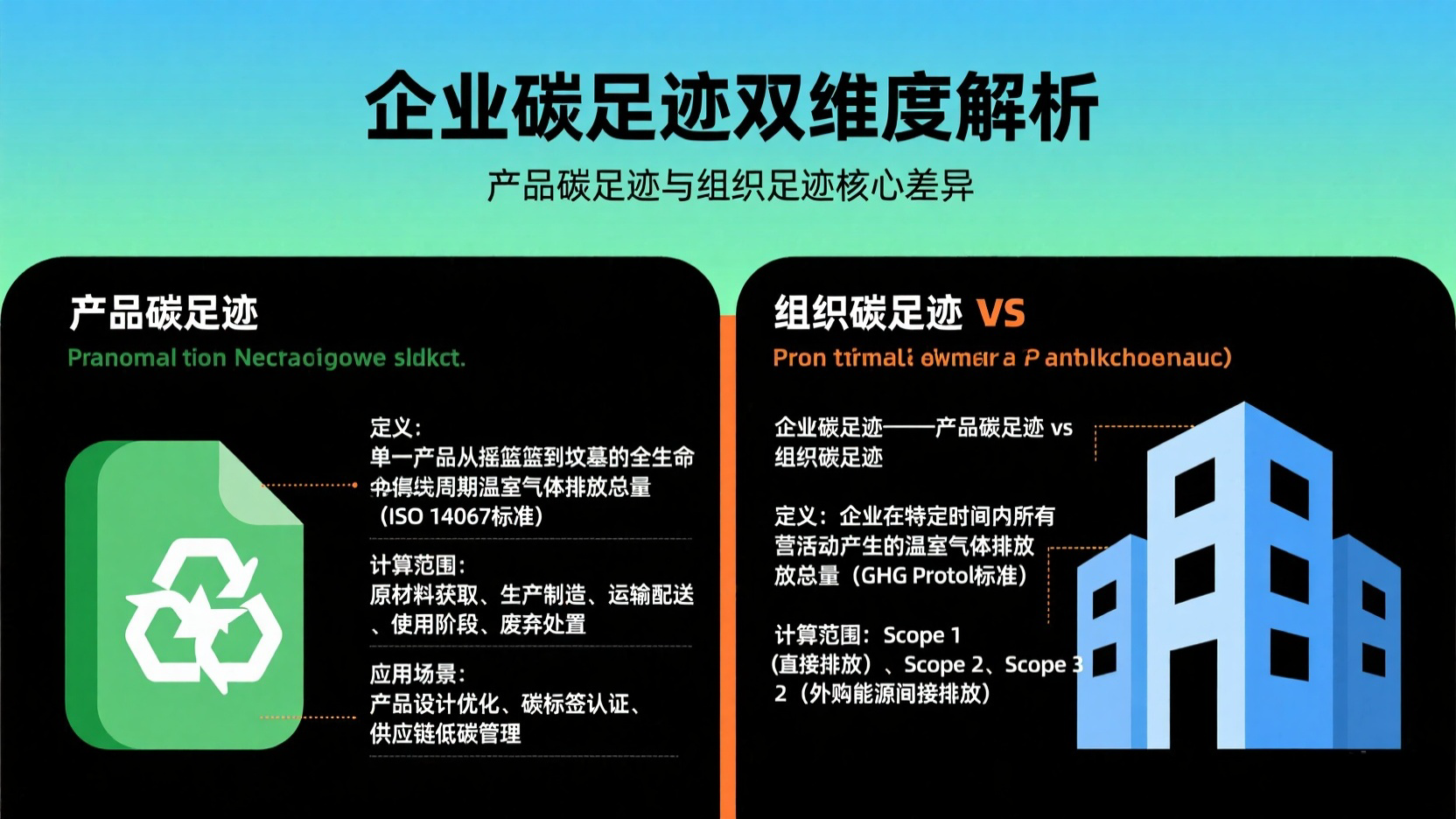 | 在“双碳”目标成为国家战略的今天,越来越多的企业开始被要求核算和报告自身的“碳足迹”。然而,当企业真正开始着手时,往往会遇到一个基本问题:到底要算的是“产品碳足迹”还是“组织碳足迹”? 这两者虽然都关乎碳排放,却是截然不同的两种核算体系,服务于不同的目标。今天,我们就来彻底厘清这两个核心概念。 1. 它是什么? 产品碳足迹衡量的是单个产品在整个生命周期中所产生的温室气体排放总量。它就像给产品做一次全面的“碳排放体检”,追踪其从出生到坟墓的每一个环节。 2. 核算边界:“从摇篮到坟墓” 原材料获取:原材料开采、种植、收获等。 生产制造:将原材料加工、组装成成品的过程。 分销运输:将产品运送到销售点或消费者手中的过程。 使用阶段:产品在使用过程中消耗能源产生的排放。 废弃处置:产品被废弃、回收或处置的过程。 小知识:在B2B交易中,也常采用 “从摇篮到大门” 的简化边界,即只计算到产品出厂为止。 3. 主要标准与应用 国际标准:ISO 14067 是专门针对产品碳足迹的核心国际标准。 核心目的: 绿色营销:为消费者提供环保选择依据,打造产品环保标签。 生态设计:帮助企业发现排放热点,从源头优化设计和供应链。 应对要求:满足下游客户(如苹果、特斯拉的供应链要求)或国际市场的准入门槛。 4. 举个例子 计算一瓶可乐的碳足迹,需要包括:制糖的农作物种植、铝罐的采矿与冶炼、饮料的灌装生产、从工厂到超市的运输、消费者冰箱冷藏的耗电,以及空罐被回收或填埋的整个过程。 1. 它是什么? 组织碳足迹衡量的是一个公司、机构或整个组织在特定时间段内(通常是一年)产生的所有温室气体排放。它就像企业的“碳排放年度财务报表”。 2. 核算边界:“三大范围” 这是由《温室气体核算体系》定义的黄金标准。 范围一(直接排放):来自公司拥有或控制的排放源。例如:锅炉燃烧天然气、公司燃油车队、化工生产工艺排放。 范围二(电力间接排放):来自公司外购的电力、热力或蒸汽的生产所产生的排放。 范围三(价值链间接排放):这是最复杂、也最易被忽略的一环,涵盖了公司价值链中所有其他间接排放。 上游:采购的原材料、商务差旅、员工通勤、上游运输等。 下游:售出产品的使用、报废处理、下游运输与分销等。 3. 主要标准与应用 核心标准:温室气体核算体系。 核心目的: 战略管理:制定科学的碳减排战略和碳中和目标。 ESG披露:向投资者、公众和评级机构展示环境绩效。 合规与交易:满足政府强制碳报要求,参与碳交易市场。 风险管理:全面识别价值链中的气候风险与成本。 4. 举个例子 一家汽车制造公司的组织碳足迹包括: 范围一:喷涂车间燃烧天然气。 范围二:所有工厂消耗的外购电力。 范围三:钢铁供应商的生产排放、员工出差坐飞机的排放、售出汽车在使用阶段燃烧汽油的排放。