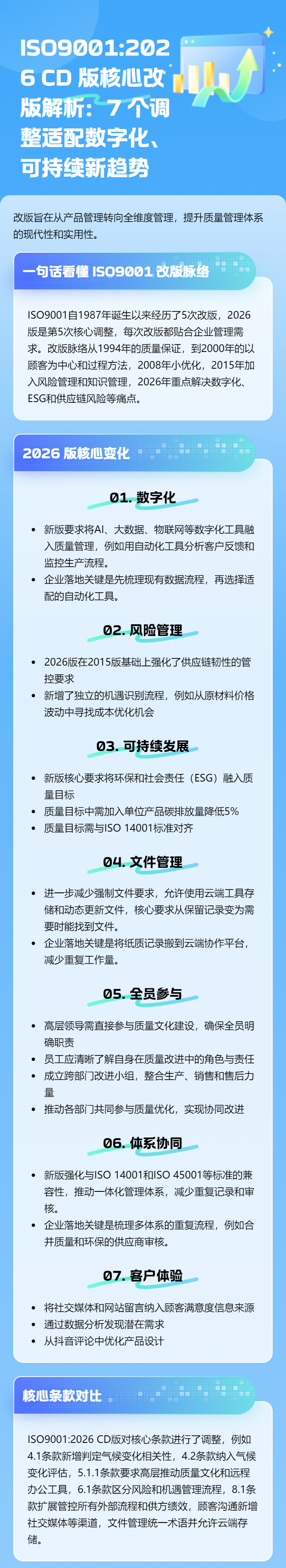 | 做质量管理的你,是否在纠结怎么把数字化、ESG 融入现有体系?2026 版 ISO 9001 的改版,刚好给出了明确方向。2025 年,ISO 9001 质量管理体系认证标准换版工作已全面启动,新版预计 2026 年 9 月正式发布,这次调整紧扣数字化、可持续发展等时代趋势,是质量管理体系的一次关键升级。 |