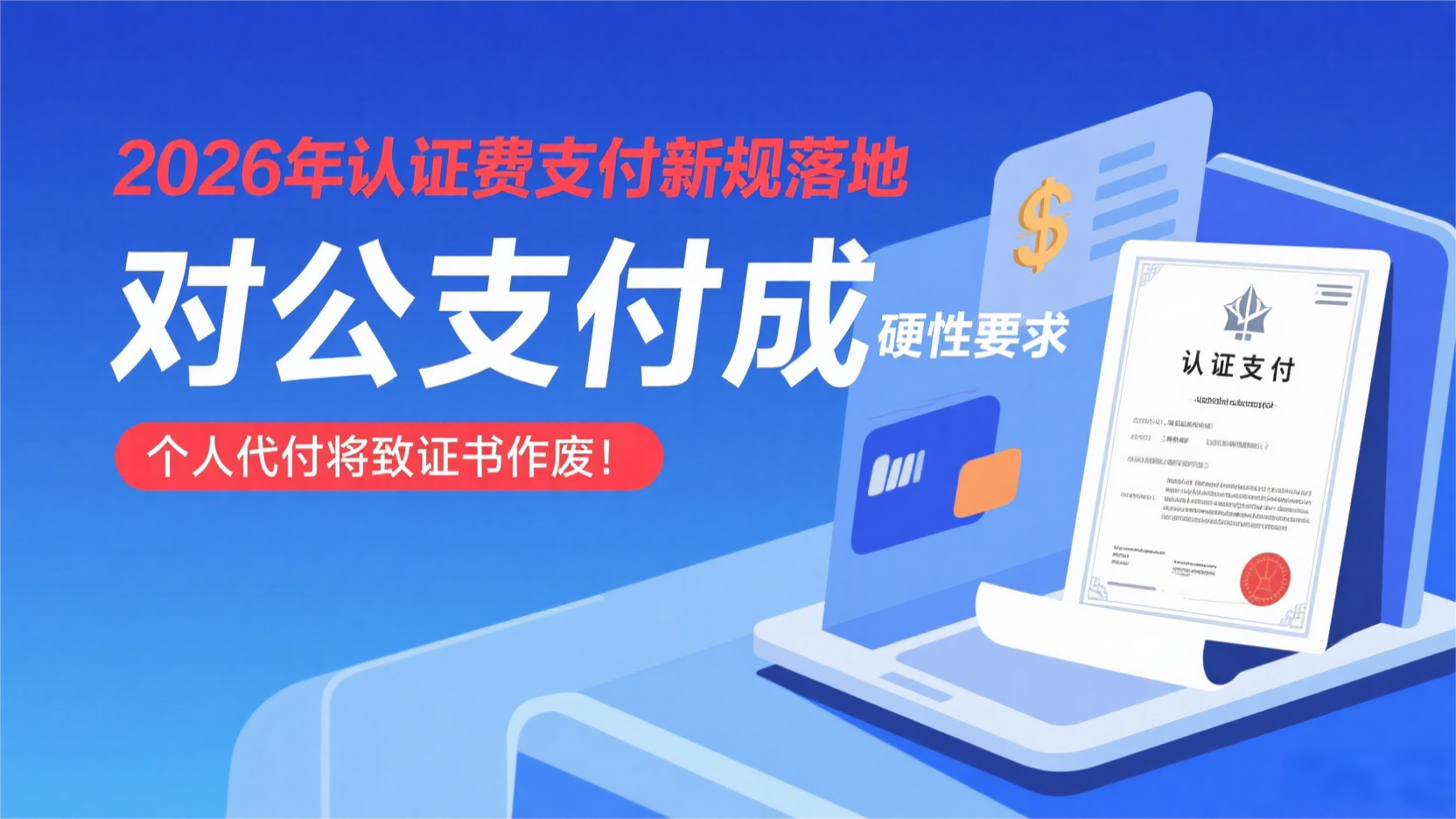 | 2026年1月1日起,认证行业迎来支付方式的“强合规变革”。国家认监委已明确划定认证费支付的“红线”,相关新规并非建议,而是强制性实施要求,企业若仍采用个人转账等不合规方式支付认证费,将面临审核结果无法注册、已发证书被追溯撤销的严重后果。本文结合官方文件与实操要点,为行业同仁全面解读新规核心内容与合规路径。 一、新规核心要求:明确支付主体与合规边界 根据国家认监委2025年发布的《质量管理体系认证规则(2025年修订版)》配套文件及《关于规范管理体系认证收费行为的通知》(认财函〔2025〕42号),新规核心要求如下: 1.支付主体规范:认证费用应由认证委托人直接支付给认证机构,其上级/下级单位支付也可接受;仅个体工商户可由经营者个人支付(部分地区允许法人账户+完税证明替代,需按地方规定处理),有限公司、股份公司等企业主体严禁个人支付。 2.支付方式合规:必须通过申请组织的对公银行账户支付,包括绑定对公账户的企业支付宝、微信(需提供付款凭证);法人/股东个人银行卡转账、员工个人微信或支付宝代付、无委托协议的第三方公司代付及现金支付等方式均被明确禁止,即使后续补开对公发票,付款流水非对公账户仍视为违规。 3.老合同整改要求:2025年12月31日前签订的老合同,若付款方式不符合新规,需签署补充协议或重新签订合同,明确“2026年1月1日起,认证费由认证委托人通过对公账户直接支付至认证机构指定账户”,并留存补充协议作为审核证据,否则2026年起合同视为无效。 二、常见操作合规性对照表